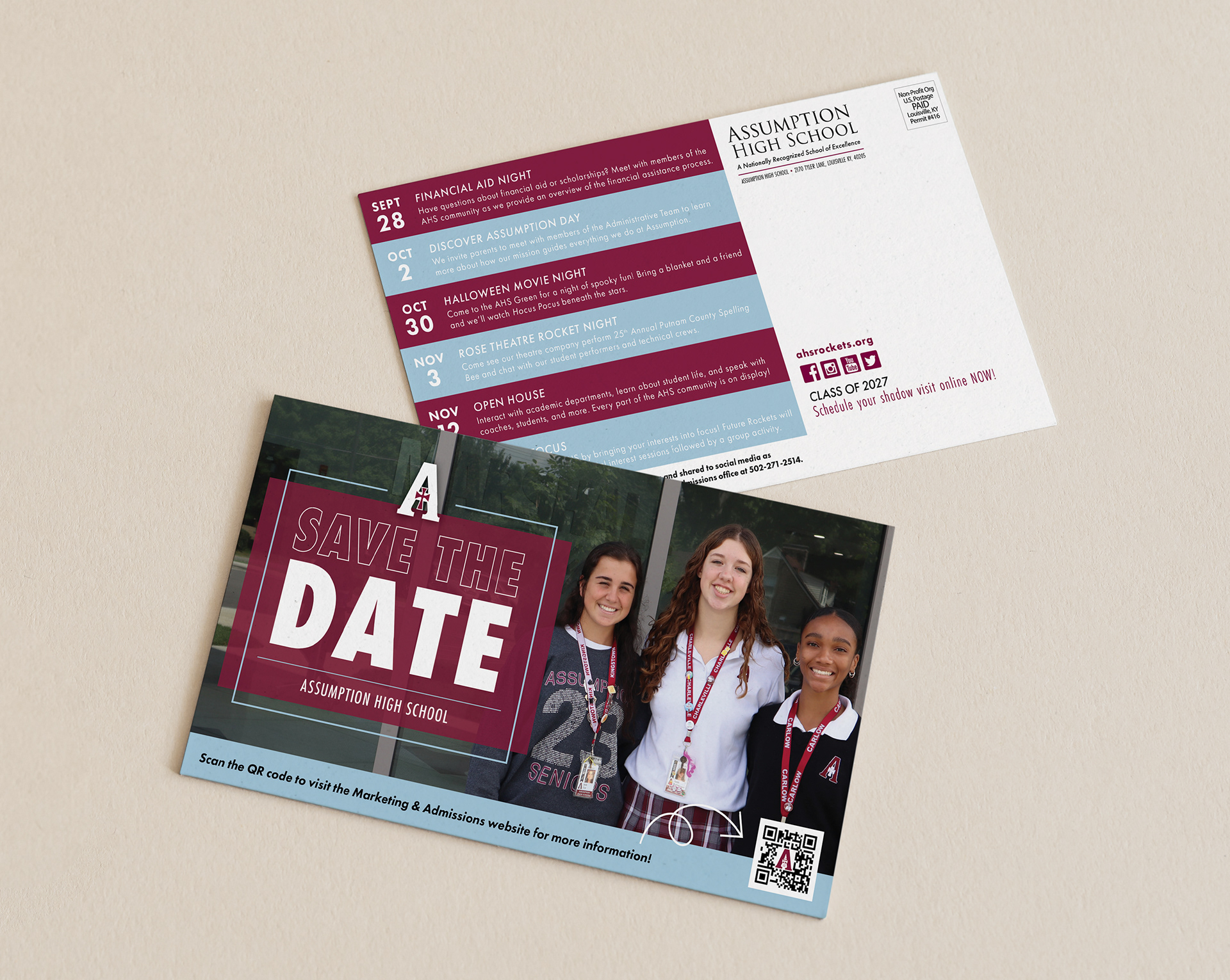 As a member of the Marketing and Admissions team, I was tasked with creating key touch points with future Rockets and their families through print and digital mediums to drive engagement and enrollment. I was in charge of the art direction, design, and copywriting for a variety of items from recruitment posters that were delivered to the Catholic grade schools around Louisville during our recruitment visit, to post cards outlining important dates for upcoming future Rocket events, and of course highlighting and promoting events on the school's social media platforms. I'd say our recruitment strategy worked as we were able to increase enrollment by 145% for the class of 2027!