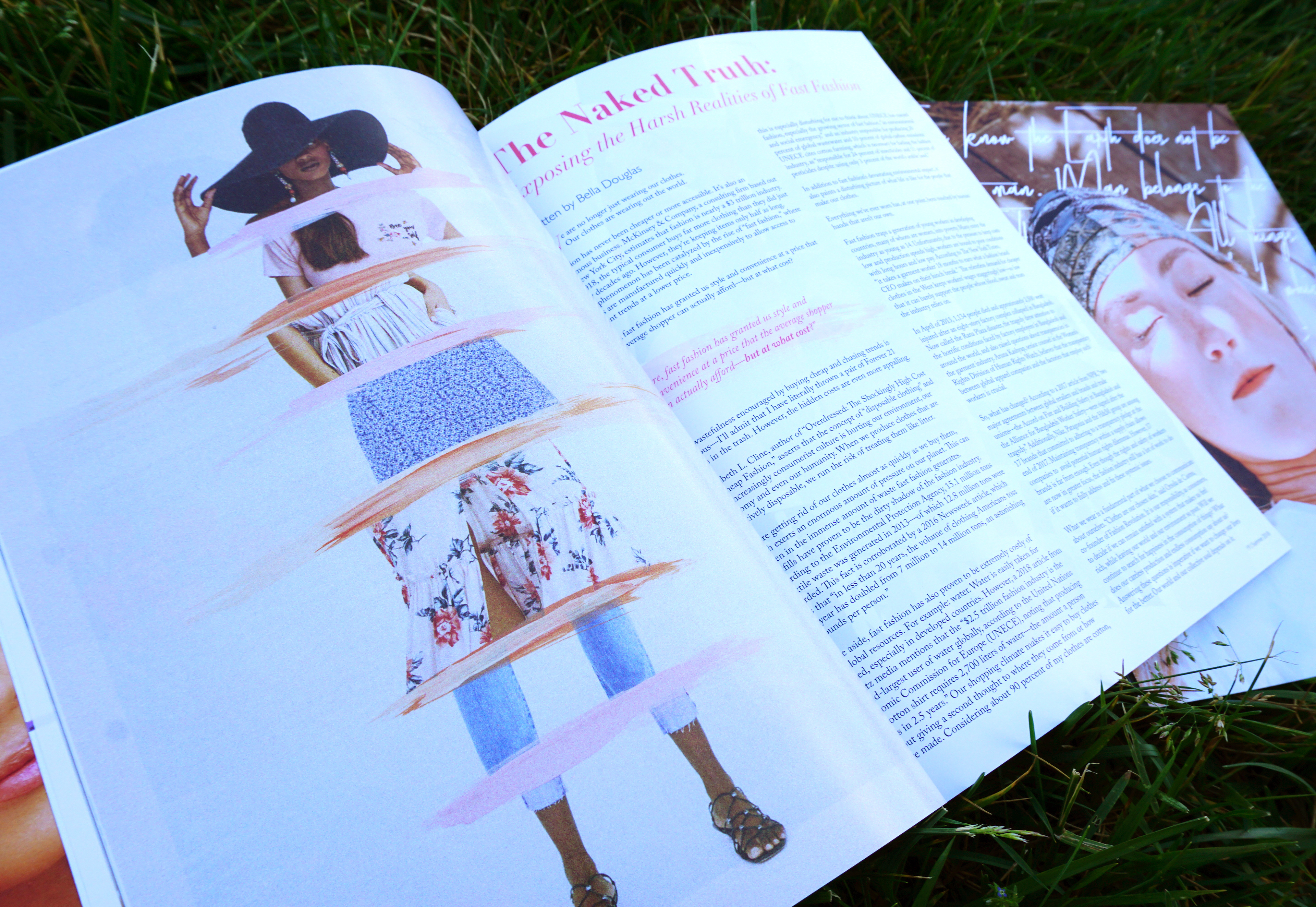 UP Magazine is a student-led fashion and lifestyle publication. For the spring issue, the executive team decided on the theme of "Re-" as in reduce, reuse, recycle. This issue focused on sustainability and the environment. The magazine was printed on recycled paper, and it was printed on larger paper than our other issues because we felt this issue was important and had a big message. I was given an article about the consequences of fast fashion. With new technology and social media, everyone wants the latest trends NOW and for a good price. Fast fashion is defined as inexpensive clothing produced rapidly by mass-market retailers in response to the latest trends. While fast fashion can make a consumer feel trendy for a moment, the lasting consequences on our environment are devastating and this cycle cannot continue as it is. I was not given photography to use for this article, so I had to make my own image to go along with the text. I decided to pull images from fast fashion websites such as Zara, H&M, and Shein to create a collage of a model sporting many different fast fashion trends. Separately, these trends could look nice, but together they clash and look messy. This represents people's disillusion that as individuals we think supporting fast fashion brands isn't a big deal, but as a community it is causing disastrous effects to our environment.